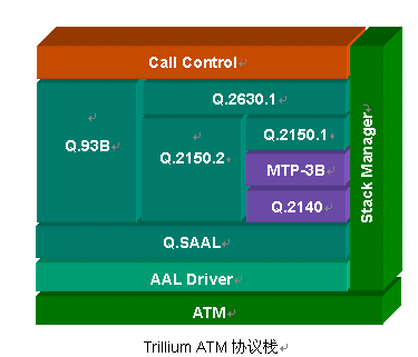 Trillium提供完整的ATM協(xié)議棧,同時支持ITU和ATM Forum的標準,相關(guān)產(chǎn)品包括AAL2 Signalling(Q.2630.1、Q.2150.1和Q.2150.2)、Q.93B(Q.2931)、Q.2140、Q.SAAL(Q.2130、Q.2110)、B-ISUP、VTOA、IME(ILMI