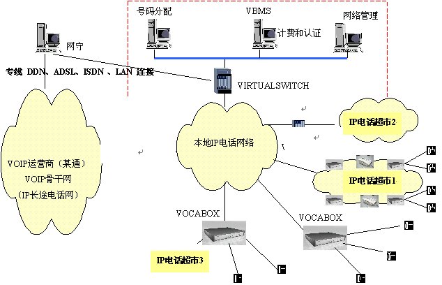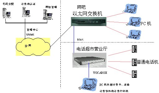 此方案的特點是將電話終端深入到公用電話的超市,用戶可以撥打IP長途電話、PSTN普通電話用戶及移動電話用戶,并在用戶端通過VOCA-BOX語音網(wǎng)關(guān)、計費卡和計費軟件實現(xiàn)本地營業(yè)廳立即計費的要求。在運營商的管理中心通過配置VBMS系統(tǒng)實現(xiàn)后臺集中計費認證功能,用于管理各個營業(yè)中心的VOCA-BOX語音網(wǎng)關(guān),各營業(yè)中心的VOCA-BOX語音網(wǎng)關(guān)提供認證計費信息給VBMS,計費類型可按實際的需求配置如:預(yù)付費、后付費等。此方案可以擴大ISP及寬帶網(wǎng)絡(luò)運營商的業(yè)務(wù)市場,增加ISP及寬帶網(wǎng)絡(luò)運營商的收益。