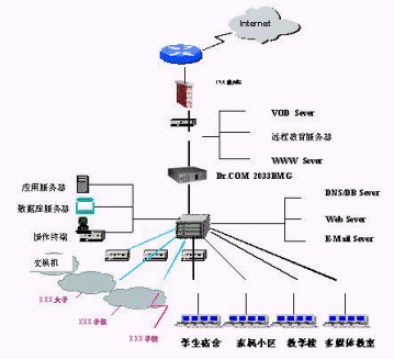 BRAS的驗(yàn)證才能上網(wǎng)。校園網(wǎng)系統(tǒng)應(yīng)能覆蓋整個(gè)校園,并連接所有的學(xué)院和辦公區(qū),為大學(xué)開展現(xiàn)代化的經(jīng)營管理和辦公教學(xué)提供一個(gè)具有開放式體系結(jié)構(gòu)的計(jì)算機(jī)網(wǎng)絡(luò)系統(tǒng),具有高度的可靠性和可擴(kuò)展能力。對校園網(wǎng)內(nèi)的每一用戶(老師或?qū)W生)、閱覽室、圖書館、多媒體教室等都能夠進(jìn)行單獨(dú)的管理、計(jì)費(fèi)(時(shí)長、時(shí)段、包月、流量)、驗(yàn)證、授權(quán)(瀏覽、下載、收發(fā)信件、網(wǎng)站屏蔽)、共享、帶寬分配。尤其對學(xué)生和老師區(qū)別的管理非常獨(dú)特。