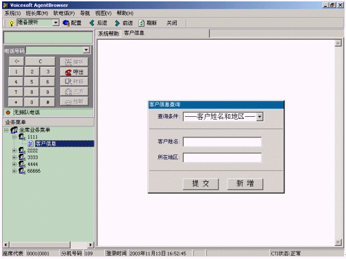 ·語音數(shù)據(jù)同步:當(dāng)電話轉(zhuǎn)到該座席上時,業(yè)務(wù)界面中將根據(jù)用戶的電話號碼以及操作信息,提示座席客戶資料