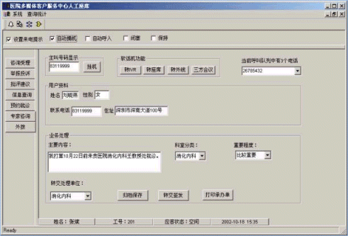 。。可能有人會問,已經(jīng)有了患者咨詢電話,為什么還要建設(shè)醫(yī)院客戶服務(wù)中心?電話是最原始的溝通手段,而且電話有它不可彌補的缺陷。電話只是一對一的服務(wù),如果有第2個人打電話進來只能聽見占線的聲音。如果訪問量很大的話,沒有多少人能真正得到專家的指導(dǎo)。客戶服務(wù)中心完全解決了這個問題,只要有一臺綜合語音服務(wù)器就可以容納至少200人同時在線,而且系統(tǒng)運行正常;訪問量增加的同時也能夠增加信息咨詢費的收入。
