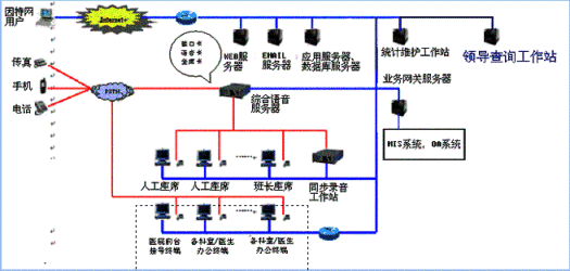 。。本系統(tǒng)提供基于計算機語音板卡和交換機兩種語音接入方式,都支持1號和7號信令線路的接入。對于20個以下座席的中小型醫(yī)院客戶服務(wù)中心系統(tǒng),則建議使用基于計算機語音板卡的形式,可以減少醫(yī)院投資,同時具有良好的系統(tǒng)性能;對于特大型的醫(yī)院客戶服務(wù)中心系統(tǒng),可選用交換機作為語音接入設(shè)備,保障系統(tǒng)的高可靠性和穩(wěn)定性。確保合理的、較少的投入,獲取最佳的配置,滿足不同醫(yī)院的需求。