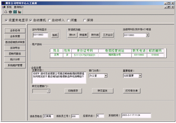 客戶打入電話后,當系統(tǒng)的自動語音應答子系統(tǒng)無法解決客戶問題時,客戶可選擇人工服務,由客戶服務代表直接接聽客戶電話,處理并解決客戶問題。此時客戶同座席話務人員直接溝通,并同時記錄下該客戶的聯(lián)系方式,將相關數(shù)據(jù)添加入系統(tǒng)數(shù)據(jù)庫;也可以在數(shù)據(jù)庫的支持下處理傳真業(yè)務,電子郵件,計算機文件傳輸、滿意度調(diào)查等。