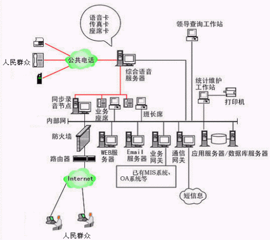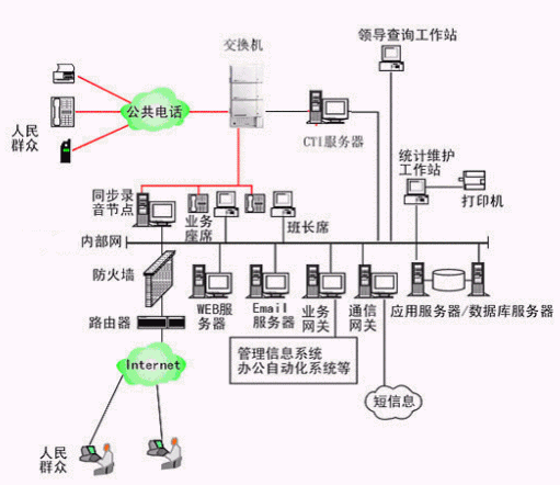 本系統(tǒng)物理結(jié)構(gòu)由排隊(duì)交換機(jī)、CTI服務(wù)器、IVR(交互式語音應(yīng)答)/IFR(交互式傳真應(yīng)答)服務(wù)器、業(yè)務(wù)代表座席(邏輯上分為:普通業(yè)務(wù)代表座席、專家座席、WEB座席等)、班長(zhǎng)座席、統(tǒng)計(jì)維護(hù)管理工作站、因特網(wǎng)(WEB)服務(wù)器、電子郵件(EMAIL)服務(wù)器、數(shù)據(jù)庫(kù)/應(yīng)用服務(wù)器、錄音留言工作站、領(lǐng)導(dǎo)查詢工作站、業(yè)務(wù)網(wǎng)關(guān)服務(wù)器、通信網(wǎng)關(guān)、網(wǎng)絡(luò)系統(tǒng)等和應(yīng)用軟件構(gòu)成。