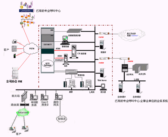 實(shí)現(xiàn)共享已有呼叫中心業(yè)務(wù)系統(tǒng)的資源:通過城域網(wǎng)或因特網(wǎng)實(shí)現(xiàn)與現(xiàn)有呼叫中心相關(guān)業(yè)務(wù)系統(tǒng)的連接與集成,諸如業(yè)務(wù)數(shù)據(jù)的提取等。一期工程僅僅留有相應(yīng)的接口。
