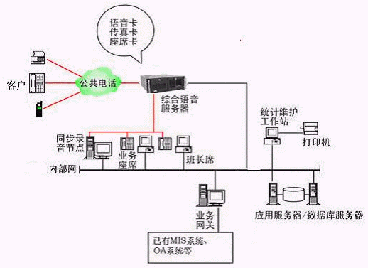 本系統(tǒng)物理結(jié)構(gòu)由帶語音板卡的高性能工控機(jī)(稱為綜合語音服務(wù)器,在功能上可以分為CTI服務(wù)器、IVR(交互式語音應(yīng)答)/IFR服務(wù)器、統(tǒng)計(jì)維護(hù)管理工作站、數(shù)據(jù)庫/應(yīng)用服務(wù)器、錄音留言工作站、業(yè)務(wù)網(wǎng)關(guān)服務(wù)器、業(yè)務(wù)代表座席、網(wǎng)絡(luò)系統(tǒng)等和應(yīng)用軟件構(gòu)成。