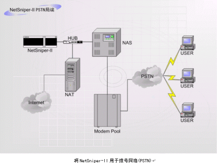 上圖中,NetSniper-II可以對(duì)網(wǎng)絡(luò)內(nèi)部各用戶進(jìn)行檢測(cè),一旦發(fā)生某個(gè)用戶安裝代理服務(wù)器軟件,其他用戶通過該用戶的接口上網(wǎng)偷逃網(wǎng)費(fèi)的情況,或發(fā)現(xiàn)盜用MAC地址上網(wǎng)及通過Modem回?fù)苌暇W(wǎng)的情況,NetSniper-II即可定位這些用戶,并且采取通知系統(tǒng)管理員或自動(dòng)封堵非法用戶等措施。