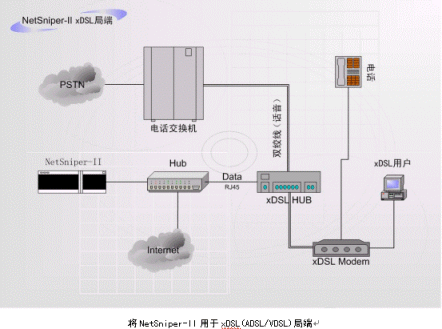 NetSniper-II也可以作為局端設(shè)備,用于xDSL(ADSL/VDSL)、PSTN(電話撥號(hào)網(wǎng)絡(luò))、HFC(有線電視網(wǎng)絡(luò))等。此時(shí),NetSniper-II能夠有效的防止控制共享上網(wǎng)、盜用MAC地址上網(wǎng)和Modem回?fù)苌暇W(wǎng)的情況發(fā)生。下面兩個(gè)圖例指出了如何將NetSniper-II用于局端。