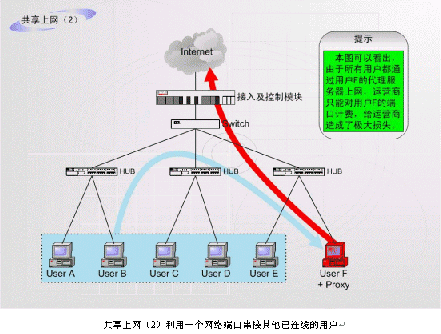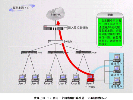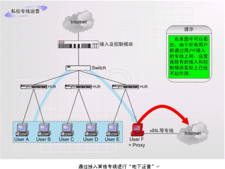 非法運(yùn)營情況之二:如上圖中的F用戶作為運(yùn)營商的合法包月用戶,上網(wǎng)服務(wù)開通以后,在自己的計(jì)算機(jī)中安裝代理服務(wù)軟件或者安裝路由器,這樣就可以隨時(shí)糾集若干住戶分?jǐn)偘沦M(fèi)用,甚至私設(shè)網(wǎng)吧。