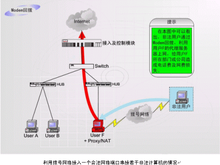這是在企業(yè)網(wǎng)絡(luò)中常見的情況:如上圖中的F用戶作為企業(yè)的合法用戶,上網(wǎng)服務(wù)開通以后,有操作人員在F計(jì)算機(jī)中安裝代理服務(wù)軟件、NAT軟件或者安裝路由器軟件,再安裝Modem等遠(yuǎn)程接入設(shè)備。非法用戶在遠(yuǎn)端通過Modem等接入設(shè)備與網(wǎng)絡(luò)相連接。