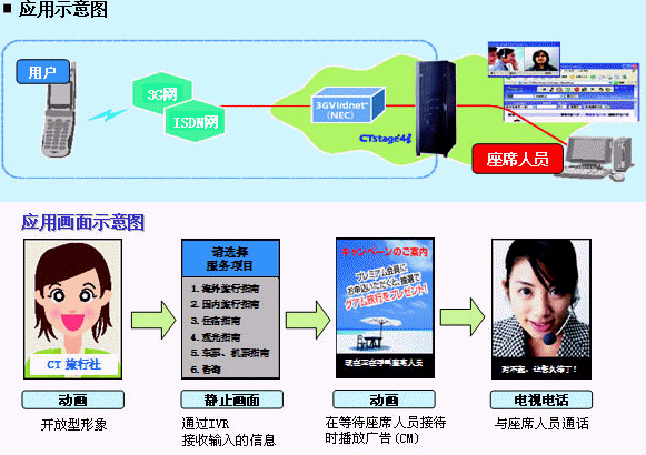 該系統(tǒng)是以O(shè)KI的呼叫中心系統(tǒng)"CTstage®4i"為基礎(chǔ),通過將NEC的視頻解決方案"3GVirdnet®(注1)"與NTTDoCoMo的3G手機(jī)"FOMA®"網(wǎng)相連,最終共同構(gòu)成了可靈活運(yùn)用"FOMA"電視電話的視頻型呼叫中心系統(tǒng)。這也是日本國(guó)內(nèi)首次開發(fā)成功的視頻型呼叫中心系統(tǒng)。