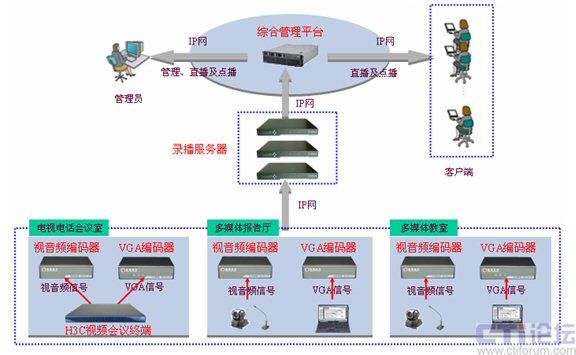 對于學(xué)校經(jīng)常進(jìn)行學(xué)術(shù)報告的錄播,可以將多媒體報告廳的視頻和音頻輸入到視音頻編碼器上,將電腦的VGA輸入到VGA編碼器上,視音頻編碼器和VGA編碼器可以將接入的信號進(jìn)行編碼,通過網(wǎng)絡(luò)傳給錄播服務(wù)器進(jìn)行信號處理、整合,最終傳輸?shù)骄C合管理平臺上。