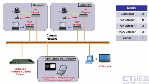 如上圖所示,服務(wù)器型號為DSS-R-T2,T系列的產(chǎn)品是銳取公司專門應(yīng)用于教育行業(yè)的產(chǎn)品。T2可支持兩個(gè)教室的同時(shí)錄制與直播,放置在學(xué)校數(shù)據(jù)中心的機(jī)房中。兩個(gè)AV Encoder和兩個(gè)VGA Encoder分別放置在需要做錄制直播的教室中。學(xué)生通過校園網(wǎng)或者Internet連接到服務(wù)器即可收看多媒體教學(xué)的直播,包括老師的圖像聲音以及講解的課件內(nèi)容。在教學(xué)樓中,每一層的走廊里都安裝了大的LCD顯示屏,服務(wù)器上的多媒體內(nèi)容也將同時(shí)傳到這些顯示屏上。