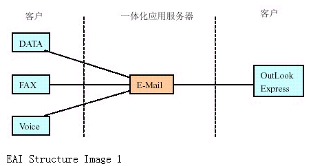 如果我們把各種信息(電話、傳真、數(shù)據(jù))在一體化應(yīng)用服務(wù)器上統(tǒng)一為E-Mail 形式在企業(yè)內(nèi)部或INTERNET 郵件系統(tǒng)轉(zhuǎn)發(fā)。實(shí)現(xiàn)起來就較簡(jiǎn)單,如下圖所示: