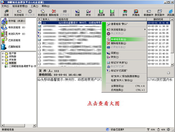二郎腿短信息群發(fā)平臺(tái)(企業(yè)版)功能強(qiáng)大、界面友好(類似OutLook風(fēng)格,操作簡(jiǎn)單),企業(yè)只需很少的投入就可以建立起自己的短信息群發(fā)中心,通過(guò)該平臺(tái)可以充分利用移動(dòng)通訊公司提供的短信息服務(wù)功能,來(lái)發(fā)布各種行業(yè)相關(guān)信息;如:短信息群組發(fā)送(如:業(yè)務(wù)廣告發(fā)布推廣)、分組發(fā) 送(如:通知各部門的工作人員 ,在不同的時(shí)間及時(shí)開會(huì))、批處理發(fā)送(自動(dòng)給不同收件人,發(fā)送不同短信息 如:工資發(fā)放通知含個(gè)人工作金額)……,還可以做到由用戶來(lái)定制或查詢他所要求的資訊。擁有二郎腿短信息群發(fā)平臺(tái)(企業(yè)版)就等于擁有一個(gè)信息管理及業(yè)務(wù)增值的有效工具。