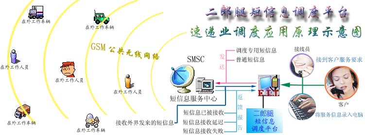 二郎腿短信息調(diào)度平臺是利用目前社會上大眾普遍擁有手機(jī)的現(xiàn)成資源,通過移動通訊公司提供的短信息服務(wù)功能作為通信信道,直接對手機(jī)進(jìn)行低層操作控制,以“收發(fā)短信息”的方式來實(shí)現(xiàn)信息的傳遞(通信資費(fèi)標(biāo)準(zhǔn)與在手機(jī)上收發(fā)短信相同)。調(diào)度平臺還對每條發(fā)出的信息的接收狀態(tài)進(jìn)行跟蹤,確保信息能被安全 、準(zhǔn)確的接收。“調(diào)度專用短信息”遵循專為各種調(diào)度工作而設(shè)計(jì)的《調(diào)度協(xié)議》,遵循該協(xié)議能最大限度避免由于“短信息服務(wù)中心”的失誤,而導(dǎo)致短信息丟失的情況。調(diào)度專用短信息對“接收設(shè)備”無特殊要求,任何支持“接收中文短信息”的手機(jī)都能實(shí)現(xiàn)。