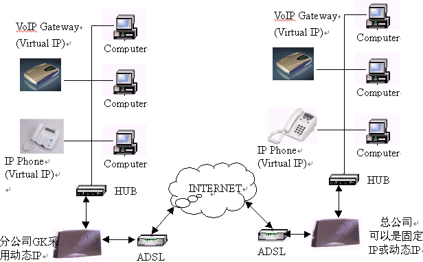 二、應(yīng)用說明:完全基于企業(yè)現(xiàn)有網(wǎng)絡(luò)環(huán)境架設(shè)VOIP系統(tǒng),企業(yè)的各分支機構(gòu)只需申請ADSL寬帶網(wǎng)絡(luò)(有條件的企業(yè)可申請專線及固定IP地址,則系統(tǒng)完全獨立),安裝晶卡開發(fā)的NOZA網(wǎng)守、IP話機或USB手柄電話,就可實現(xiàn)免費通話。