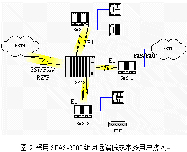 SPAS可編程交換機(jī)通過E1可以支持多個(gè)遠(yuǎn)端模塊。遠(yuǎn)端模塊采用SPAS-SAS框,可以帶多種用戶接口:普通模擬用戶、DDN、環(huán)路中繼用戶;通過 SPAS主模塊對(duì)外提供各種信令接入。適合多點(diǎn)接入組網(wǎng),且組網(wǎng)成本低。組網(wǎng)圖見圖2: