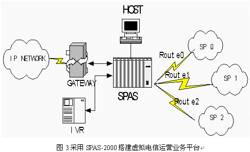 中國加入WTO后,國內(nèi)與國際的聯(lián)系、交流和溝通將會(huì)越來越頻繁,這一趨勢(shì)帶來了巨大的電信服務(wù)市場(chǎng)商機(jī)。同時(shí),國際電信企業(yè)正在尋求進(jìn)入中國的途徑,國內(nèi)新興的電信運(yùn)營商積極應(yīng)對(duì)這種局面,而虛擬電信運(yùn)營商也在國內(nèi)開始出現(xiàn)。如何爭取客戶是所有這些提供電信服務(wù)的企業(yè)共同面臨的課題。一個(gè)智能化的、高效的、靈活的、有特點(diǎn)并易于控制的服務(wù)平臺(tái)無疑是他們進(jìn)行競爭的重要工具。由于SPAS-2000可編程交換機(jī)是一個(gè)全開放的靈活平臺(tái),用戶通過應(yīng)用程序幾乎可以完全控制交換,能很好的滿足用戶的需求。在此SPAS-2000可編程交換機(jī)上開發(fā)的電話批發(fā)及零售業(yè)務(wù)應(yīng)用,配合計(jì)算機(jī)技術(shù),能靈活控制業(yè)務(wù)的路由選擇、費(fèi)率計(jì)算并可提供個(gè)性化服務(wù),為運(yùn)營商降低運(yùn)營成本,提高服務(wù)質(zhì)量給出了有效的解決方案。例如一個(gè)IP電話運(yùn)營商在全球互連中可能有多個(gè)合作伙伴,每個(gè)合作伙伴提供的服務(wù)也不相同,為了節(jié)省費(fèi)用并提高服務(wù)質(zhì)量,IP電話運(yùn)營商需要根據(jù)時(shí)段、費(fèi)率、通話質(zhì)量、接通率等指標(biāo)智能選擇去話路徑。SPAS-2000可編程交換機(jī)提供編程開發(fā)接口,通過E1與IVR連接,在服務(wù)器上開發(fā)高層應(yīng)用軟件,可以實(shí)現(xiàn)多種高級(jí)功能。同時(shí)SPAS還可以連接各種型號(hào)的網(wǎng)關(guān)。應(yīng)用連接圖見圖3: