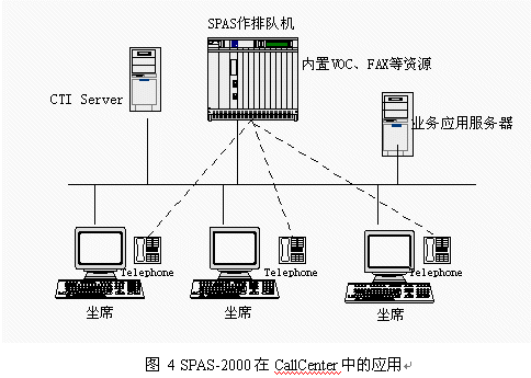 目前國內(nèi)呼叫中心的建設(shè)方興未艾,企業(yè)為了改善服務(wù),贏得客戶,紛紛建設(shè)自身的呼叫中心。如果建立呼叫中心全部采用國外設(shè)備,價(jià)格非常昂貴,使很多客戶望而卻步。這樣大的投資目前也只有電信(包括移動(dòng)和聯(lián)通)、電力、銀行等資金充裕的行業(yè)才能承受。而且,根據(jù)我方了解,即使這些行業(yè)也在控制采購成本,原先只注重名牌,不計(jì)成本的情況正在改變。而在目前宏觀經(jīng)濟(jì)形勢(shì)不景氣的大背景下,大中型企業(yè)既要加快企業(yè)信息化建設(shè),保住客戶,降低成本,又要精打細(xì)算,規(guī)避投資風(fēng)險(xiǎn)。我們掌握建立呼叫中心設(shè)備的所有核心技術(shù),因此在呼叫中心應(yīng)用方面有很大的價(jià)格優(yōu)勢(shì),這樣就降低了擁有呼叫中心的門檻,在這個(gè)市場(chǎng)上也有很強(qiáng)的競爭力。采用SPAS-2000可編程交換機(jī)支持智能業(yè)務(wù)通用編程接口,可以作為CallCenter核心設(shè)備,應(yīng)用圖見圖4:
