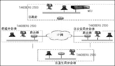 此次應(yīng)用的視頻會議終端位于東城區(qū)政府所轄范圍內(nèi)的各重要單位,通過H.323網(wǎng)絡(luò)召開內(nèi)部工作會議,從而方便地實現(xiàn)實時交互式遠(yuǎn)程會議,會議電視系統(tǒng)設(shè)計使用速率支持1.5Mbps,控制方式采用全網(wǎng)星型集中式控制方式。