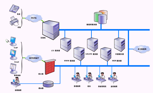 SmartCon呼叫中心由數(shù)字程控交換機(或中繼板卡)、計算機電話集成服務器(SmartCTI)、交互式語音/傳真應答服務器(SmartIVR/IFR)、多通道數(shù)字錄音服務器(SmartMDR)、自動呼叫分配服務器(SmartACD)、地理信息系統(tǒng)服務器(SmartGIS)、Email服務器、座席終端系統(tǒng)(SmartAgent)、業(yè)務統(tǒng)計管理子系統(tǒng)、系統(tǒng)安全管理子系統(tǒng)、數(shù)據(jù)庫服務器等組成,其中交換機又可作為本單位內(nèi)部電話交換機使用。系統(tǒng)的網(wǎng)絡結(jié)構(gòu)示意圖如下: