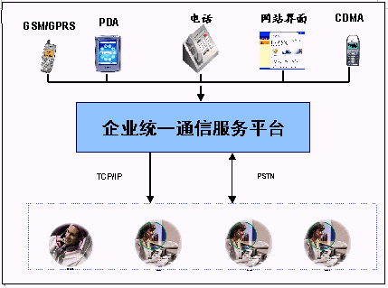 統(tǒng)一通信平臺提供了與企業(yè)內(nèi)部交換機(jī)(PBX)或PSTN,寬帶或INTERNET和GSM或GPRS網(wǎng)絡(luò)的接口,融合了多種網(wǎng)絡(luò)資源和企業(yè)內(nèi)部數(shù)據(jù)源。為用戶提供了多種服務(wù)界面:WEB界面、人工服務(wù)界面,IVR界面。同時(shí)為用戶提供短信息等數(shù)據(jù)業(yè)務(wù)。