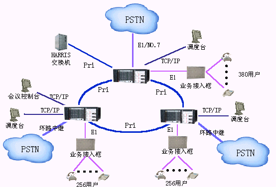 該方案適用于用戶需要建立自己的通信網(wǎng)并能實現(xiàn)行政交換、電話會議、調(diào)度交換、語音信箱等多種功能。這種方案解決的業(yè)務(wù)種類多,能滿足用戶的多種需要。