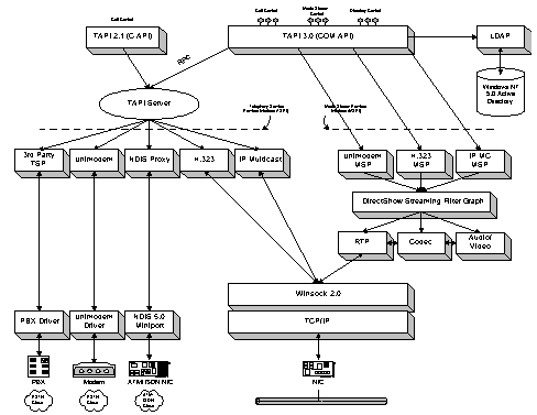 最新的TAPI 3.0基于微軟的COM標(biāo)準(zhǔn),它允許TAPI應(yīng)用程序采用包括JAVA?、Visual Basic?、Visual C++?在內(nèi)的各種語言進(jìn)行編寫,同時(shí)還可以方便的通過ActiveX技術(shù)將其移植到互聯(lián)網(wǎng)中去。TAPI除了支持傳統(tǒng)的電話應(yīng)用,還支持標(biāo)準(zhǔn)的H.323會(huì)議和IP多點(diǎn)會(huì)議,良好的QoS支持使得它增強(qiáng)了會(huì)議的質(zhì)量和網(wǎng)絡(luò)的可管理性。TAPI采用了統(tǒng)一的媒體流接口-DirectShowTM,TAPI媒體流提供商(MSP)只要針對不同的電話提供商(TSP)來實(shí)現(xiàn)DirectShowTM接口就可以被應(yīng)用程序使用。