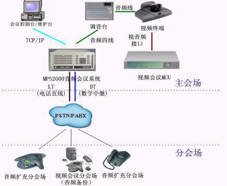 - MPS2000音頻會議系統(tǒng)通過音頻四線接口與主會場調(diào)音臺相連,保證視頻MCU中的音頻與音頻會議系統(tǒng)中的音頻互通。
