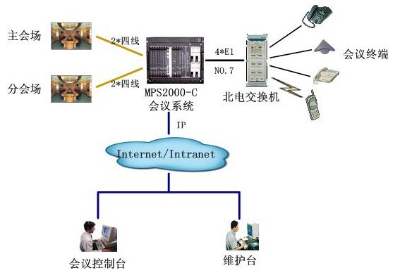 該會議系統(tǒng)通過4個數(shù)字中繼,與北電用戶交換機互連,采用PRI信令。與視頻會議系統(tǒng)主會場采用四線音頻接口接主會場調(diào)音臺,保證與視頻會議系統(tǒng)音頻的無縫對接。通過以太網(wǎng)口與局域網(wǎng)連接,實現(xiàn)維護管理及會議控制等功能。