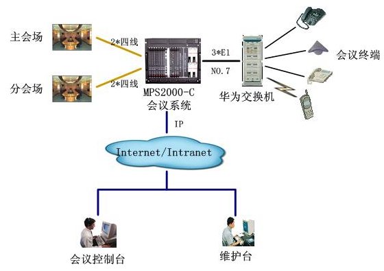 該會議系統(tǒng)通過3個數(shù)字中繼,與華為用戶交換機(jī)互連,通信采用NO.7信令。4路4線中2路接主會場調(diào)音臺,2路分會場調(diào)音臺,實現(xiàn)會議室擴(kuò)音設(shè)備的接入。通過以太網(wǎng)口與D-LINK網(wǎng)絡(luò)交換機(jī)互連,接入廊坊電力的局域網(wǎng),實現(xiàn)維護(hù)管理及會議控制等功能。