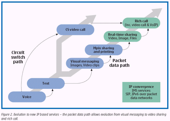 首個IP整合服務(wù)(例如視頻共享和內(nèi)容共享)是向豐富的通話方式發(fā)展的關(guān)鍵。這是一個以語音、視頻和文本為形式的基于會話通訊的概念,它支持在會話參與者之間共享相同的內(nèi)容,例如圖片、數(shù)據(jù)和其它增值信息。