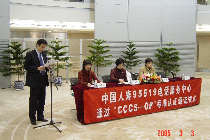 下午2點(diǎn),在中國(guó)人壽保險(xiǎn)股份有限公司總部舉行了隆重的頒證儀式。中國(guó)人壽保險(xiǎn)股份有限公司總部及江蘇、四川、深圳分公司的95519呼叫中心順利通過(guò)CCCS標(biāo)準(zhǔn)認(rèn)證。其中,中國(guó)人壽總部及江蘇省分公司95519呼叫中心獲準(zhǔn)CCCS五星級(jí)認(rèn)證評(píng)定,四川省及深圳市95519呼叫中心獲準(zhǔn)CCCS四星級(jí)認(rèn)證評(píng)定。