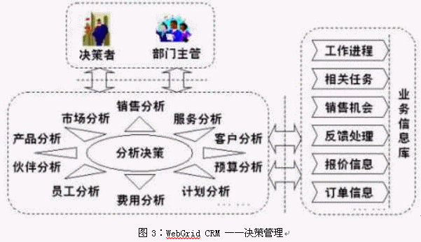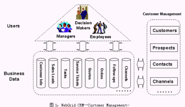 WebGrid CRM是基于CRM理念而設(shè)計(jì)的,它將面向客戶的所有業(yè)務(wù)進(jìn)行整合,提供了統(tǒng)一的業(yè)務(wù)平臺(tái),并使用工作流技術(shù)將各種業(yè)務(wù)緊密聯(lián)系起來。WebGrid CRM 的功能可以歸納為三個(gè)方面:1) 對銷售、營銷和客戶服務(wù)三部分業(yè)務(wù)流程的信息化;2) 與客戶進(jìn)行溝通所需要的手段(如電話、傳真、網(wǎng)絡(luò)、Email等)的集成和自動(dòng)化處理;3) 對上面兩部分功能所積累下的信息進(jìn)行的加工處理,產(chǎn)生客戶智能,為企業(yè)的戰(zhàn)略戰(zhàn)術(shù)的決策作支持。見下圖所示: