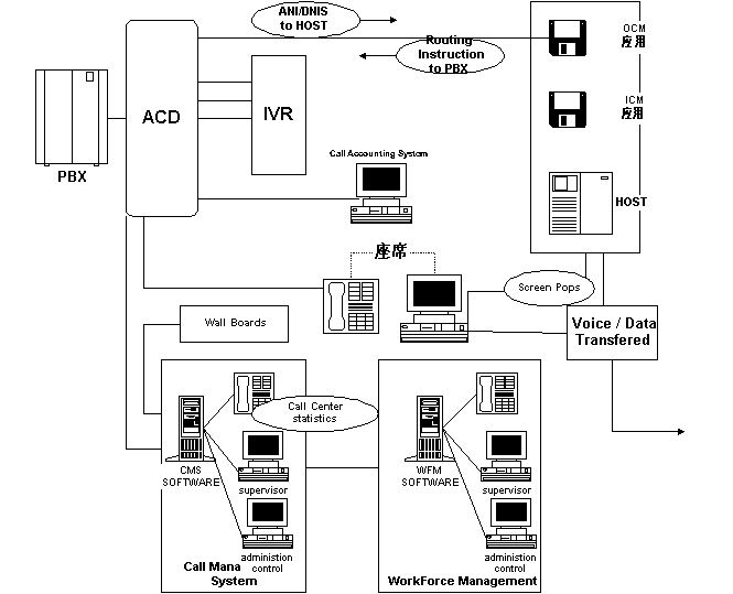 這種方案的核心思想是在專用交換機(jī)+ACD的基礎(chǔ)上擴(kuò)展路由和統(tǒng)計(jì)的功能,開(kāi)放CTI -Link接口,用CTI技術(shù)實(shí)現(xiàn)通信和計(jì)算機(jī)的功能結(jié)合,再配以必要的語(yǔ)音和數(shù)據(jù)庫(kù)系統(tǒng),從而以強(qiáng)大的通信和計(jì)算機(jī)功能滿足呼叫中心的要求。
