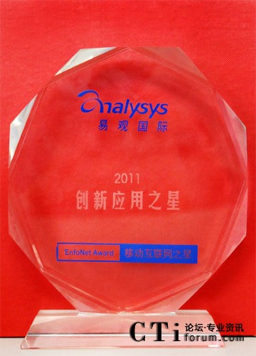 易觀國(guó)際成立于2000年,是中國(guó)信息化、互聯(lián)網(wǎng)和新媒體以及電信運(yùn)營(yíng)行業(yè)規(guī)模最大的中國(guó)科技市場(chǎng)領(lǐng)先的研究和咨詢機(jī)構(gòu)。2011易觀“EnfoNet Award–移動(dòng)互聯(lián)網(wǎng)之星”評(píng)選是易觀年度產(chǎn)業(yè)盛會(huì)——首屆移動(dòng)互聯(lián)網(wǎng)博覽會(huì)暨第四屆易觀移動(dòng)互聯(lián)網(wǎng)年會(huì)的重要組成部分,是易觀國(guó)際(Analysys International)為推薦中國(guó)互聯(lián)網(wǎng)及移動(dòng)互聯(lián)網(wǎng)產(chǎn)業(yè)中表現(xiàn)優(yōu)異且具備發(fā)展?jié)摿Φ钠脚_(tái)及應(yīng)用而設(shè)立。