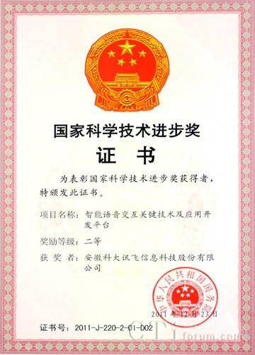CTI論壇(ctiforum)2月20日消息(記者 浩宇):2月14日,2011年度國家科學(xué)技術(shù)獎勵大會在北京隆重舉行,黨和國家領(lǐng)導(dǎo)人胡錦濤、溫家寶、李長春、李克強出席大會并為獲獎代表頒獎。由科大訊飛和中國科學(xué)技術(shù)大學(xué)聯(lián)合提交的“智能語音交互關(guān)鍵技術(shù)及應(yīng)用開發(fā)平臺”項目榮獲國家科技進步二等獎,在本年度信息化領(lǐng)域(計算機與自動控制、通信、現(xiàn)代服務(wù)業(yè)信息化等專業(yè)組)一等獎空缺的情況下,該項目在計算機與自動控制專業(yè)組所有項目中排名第一。這是科大訊飛第二次獲得這一國家獎重大榮譽,也是語音產(chǎn)業(yè)界唯一獲此殊榮的企業(yè)。