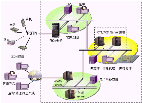 將PSTN訪問、Internet訪問有機結合,對傳統(tǒng)呼叫中心進行擴充,支持多種接入方式,多種交流渠道,具有傳統(tǒng)呼叫中心無法比擬的優(yōu)越性。