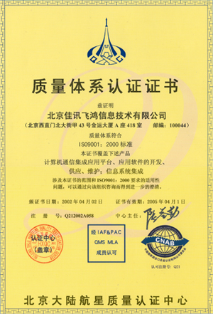 經(jīng)過近半年時(shí)間的建立和保持質(zhì)量體系運(yùn)行,佳訊飛鴻于在2002年3月順利的通過為期三天的嚴(yán)格審核,并重點(diǎn)對(duì)佳訊公司核心技術(shù)的CTI平臺(tái)進(jìn)行審核。2002年4月2日通過了ISO國際組織的新體系標(biāo)準(zhǔn)ISO9001:2000的體系認(rèn)證,取得了通過該標(biāo)準(zhǔn)的認(rèn)證證書。佳訊飛鴻公司也成為國內(nèi)第一家對(duì)CTI平臺(tái)進(jìn)行審核并通過認(rèn)證的公司。其完成標(biāo)志著公司從成立之時(shí)起即嚴(yán)格遵循國際企業(yè)標(biāo)準(zhǔn)及現(xiàn)代企業(yè)管理模式,以軟件產(chǎn)品質(zhì)量管理體系為載體,以客戶需求為導(dǎo)向。全面提高產(chǎn)品、服務(wù)質(zhì)量,順應(yīng)不斷變化的技術(shù)發(fā)展方向和市場變化,在質(zhì)量、技術(shù)、成本和交期等方面全力滿足客戶需求,為客戶提供最佳性價(jià)比的產(chǎn)品和服務(wù)。