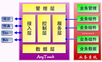 AnyTouch不僅僅是一個面向應(yīng)用開發(fā)商、系統(tǒng)集成商的CTI中間件產(chǎn)品,而且提供支持最終用戶自我維護、開發(fā)、編輯的業(yè)務(wù)接口與開發(fā)工具包;贏nyTouch,可以根據(jù)不同的行業(yè)需求開發(fā)出不同的業(yè)務(wù)應(yīng)用系統(tǒng),從而構(gòu)筑屬于自己的呼叫中心、企業(yè)增值服務(wù)、通訊服務(wù)、信息服務(wù)及CRM系統(tǒng)。
