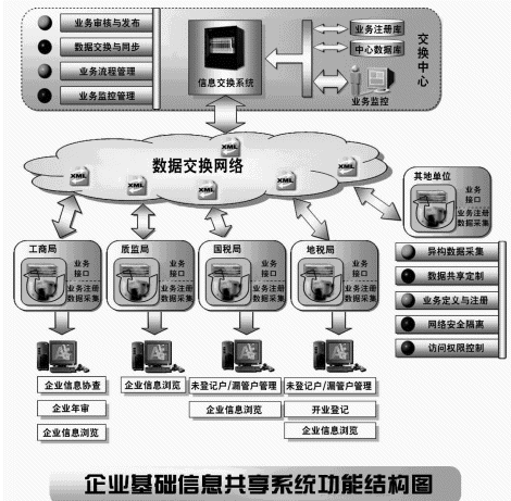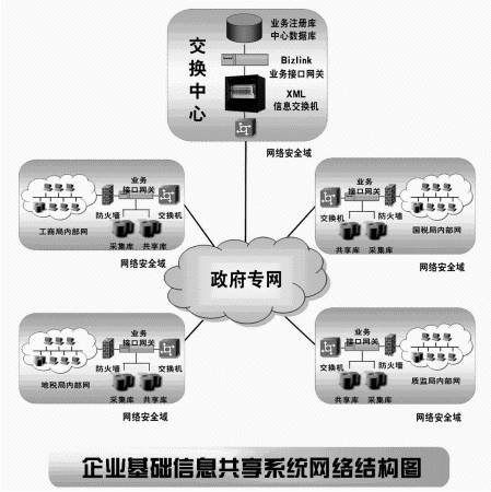 (1) 通過(guò)企業(yè)基礎(chǔ)信息交換與共享系統(tǒng)將不同的政府部門(mén)辦公網(wǎng)絡(luò)連接在一起,形成資源共享,消除孤島現(xiàn)象;
