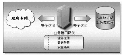 為了實(shí)現(xiàn)企業(yè)基礎(chǔ)信息交換與共享,各個(gè)接入平臺(tái)的單位必須將需要提供給其他單位的企業(yè)數(shù)據(jù)共享出來(lái),基于安全、保密等多種因素考慮,這些單位的業(yè)務(wù)數(shù)據(jù)庫(kù)不可以也不應(yīng)該對(duì)其他單位完全開(kāi)放(也就是直接連在政府專(zhuān)網(wǎng)上),而業(yè)務(wù)接口網(wǎng)關(guān)的作用就是將業(yè)務(wù)數(shù)據(jù)庫(kù)與政府專(zhuān)網(wǎng)之間的隔離、實(shí)現(xiàn)業(yè)務(wù)注冊(cè)以及數(shù)據(jù)采集等功能。業(yè)務(wù)接口網(wǎng)關(guān)的兩個(gè)網(wǎng)絡(luò)端口分別連接業(yè)務(wù)數(shù)據(jù)庫(kù)以及政府專(zhuān)網(wǎng),機(jī)關(guān)單位將它們業(yè)務(wù)數(shù)據(jù)庫(kù)中需要共享的業(yè)務(wù)數(shù)據(jù)項(xiàng)名稱(chēng)注冊(cè)到信息中心的業(yè)務(wù)注冊(cè)庫(kù)中,其他機(jī)關(guān)單位通過(guò)查詢(xún)業(yè)務(wù)注冊(cè)庫(kù)獲取對(duì)方單位的業(yè)務(wù)注冊(cè)信息,并通過(guò)自己的業(yè)務(wù)接口網(wǎng)關(guān)向信息交換機(jī)發(fā)出業(yè)務(wù)數(shù)據(jù)采集的要求,信息交換機(jī)接收請(qǐng)求后對(duì)請(qǐng)求進(jìn)行校驗(yàn),校驗(yàn)通過(guò)后信息交換機(jī)會(huì)通過(guò)被采集業(yè)務(wù)數(shù)據(jù)庫(kù)所在單位的業(yè)務(wù)接口網(wǎng)關(guān)獲取業(yè)務(wù)數(shù)據(jù),數(shù)據(jù)通過(guò)信息交換機(jī)交換到采集單位的業(yè)務(wù)接口網(wǎng)關(guān),此時(shí)采集單位可以將數(shù)據(jù)保存在己方的采集數(shù)據(jù)庫(kù)中,或者直接由應(yīng)用系統(tǒng)使用。