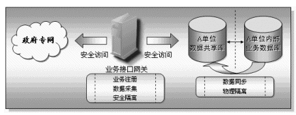 業(yè)務(wù)接入網(wǎng)關(guān)放置在每一個(gè)接入到本系統(tǒng)的部門(mén)或單位內(nèi),具有快速方便的異構(gòu)數(shù)據(jù)庫(kù)的連接能力,它主要完成兩個(gè)方面的功能,一方面實(shí)現(xiàn)本部門(mén)共享信息的對(duì)外發(fā)布,另一方面也通過(guò)核心的信息交換機(jī)實(shí)現(xiàn)其它相關(guān)部門(mén)的共享信息的采集工作。業(yè)務(wù)接口網(wǎng)關(guān)具有兩個(gè)網(wǎng)絡(luò)接口,一端連接本單位的內(nèi)部網(wǎng)絡(luò),另一端接入政府專(zhuān)網(wǎng)中。
