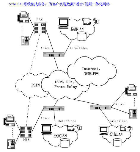 在這里,數據/話音/視頻一體化網絡主要是指多分支機構集團化企業(yè),通過ISDN、DDN、Frame Relay、Internet、寬帶IP等廣域網互聯(lián)手段,實現(xiàn)Data/Voice/Video"總線復用"的增值技術。