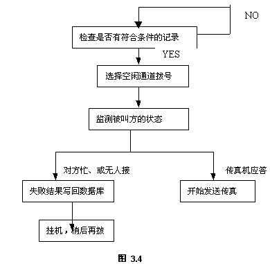 傳真發(fā)送功能是服務(wù)器后臺(tái)操作的,系統(tǒng)定時(shí)檢查傳真發(fā)送庫(kù),一旦有符合條件的記錄,自動(dòng)選擇空閑端口,按設(shè)定的傳真號(hào)碼撥號(hào),檢查被叫方的狀態(tài),若對(duì)方有傳真機(jī)應(yīng)答,則開始發(fā)送傳真;若對(duì)方忙、或無(wú)人接,系統(tǒng)稍后會(huì)再次試撥。若超過(guò)設(shè)定次數(shù)仍未發(fā)送成功,系統(tǒng)會(huì)通知發(fā)送人作其它處理。