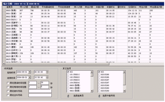 呼叫統(tǒng)計(jì)是呼叫中心最重要的功能。該呼叫中心系統(tǒng)設(shè)計(jì)了一整套豐富的呼叫統(tǒng)計(jì)管理工具,能有效地實(shí)現(xiàn)對業(yè)務(wù)、設(shè)備、人員的全面管理,使呼叫中心隨著運(yùn)營的過程效益不斷地提高。同時(shí)提供實(shí)時(shí)的監(jiān)控工具,使管理人員及時(shí)了解整個(gè)系統(tǒng)的運(yùn)行狀態(tài)。