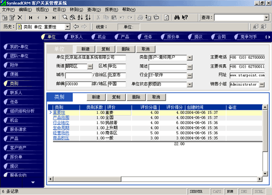 客戶單位的分類較聯(lián)系人的分類更復(fù)雜。常用的分類有:按照企業(yè)規(guī)模來分類(大、中、小,層次自定義,下同)、按照該客戶與本單位的緊密程度分類(緊密、普通、疏遠)、按照該客戶的重要性分類(重要、普通、次要)、按照該客戶的忠誠度分類(忠誠、普通、游移)。有一些用戶企業(yè),希望對客戶單位特征進行采集,進而進行客戶信用評價。信用特征的類別可以多達數(shù)十種類(詳細情況可參考有關(guān)書籍)。利用SynleadCRM,您可以為每個類指定系數(shù),為類下屬的每個評價指定評分分值。例如,您可以建立一個類別為"客戶倉庫積壓商品的情況",系數(shù)為1,該類別下屬的評價有"很多1分"、"一般3分"、"少1分"、"未知0分",如果指定某客戶該類別的評價為一般,則該項目得分為3分*1(系數(shù))=3分。依此類推,您還可以指定更多的分類與評價,例如:客戶經(jīng)營場所所處的位置、客戶在企業(yè)生命周期中所處的位置、客戶在行業(yè)中的地位、客戶產(chǎn)品的組合情況、客戶產(chǎn)品覆蓋的市場范圍、客戶產(chǎn)品的淡旺季規(guī)律、客戶近年營業(yè)額的增減趨勢、客戶的年度營業(yè)額、客戶的現(xiàn)金周轉(zhuǎn)能力、客戶的負債情況、客戶是否涉及中大訴訟等。每一個類別項目的評分經(jīng)過系數(shù)的加權(quán)運算后,可以求和,得到這個客戶的總評分。未來也可以利用分析模型對此類數(shù)據(jù)進行進一步的分析,提供輔助決策所需要的圖表和報表。