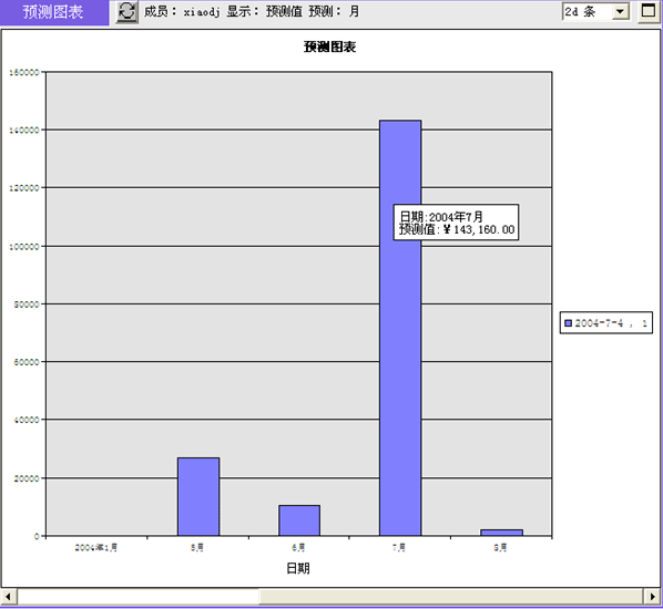 * 100% = 504,402.50元的一個預(yù)測值,在相同時間段的機(jī)會預(yù)測值將被累計求和。很顯然,可以在不同時間點(diǎn)(例如6月1日、7月1日、8月1日、9月1日)多次對2004年9月的銷售額進(jìn)行預(yù)測。得到一系列的銷售預(yù)測值變動趨勢。