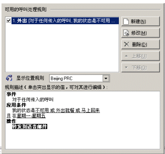 用戶可以很方便地設(shè)置自己的來電處理規(guī)則 ,如:設(shè)置外出時,所有來電轉(zhuǎn)到語音郵箱。